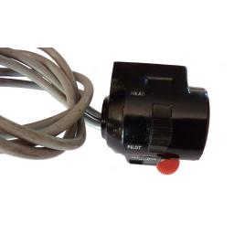 A complete switch, without the lever to fit the right hand side of the Norton Commando. The red buttoned cut out switch has the caption, OFF RUN OFF and the black headlight switch, HEAD and PILOT. This is a new old stock switch in excellent condition. There are 2 pairs of wires: One pair is white and white/yellow the other pair is blue and yello/blue. The wires have bullet connnectors.  The switch is stamped LUCAS 187SA-R on the underside.